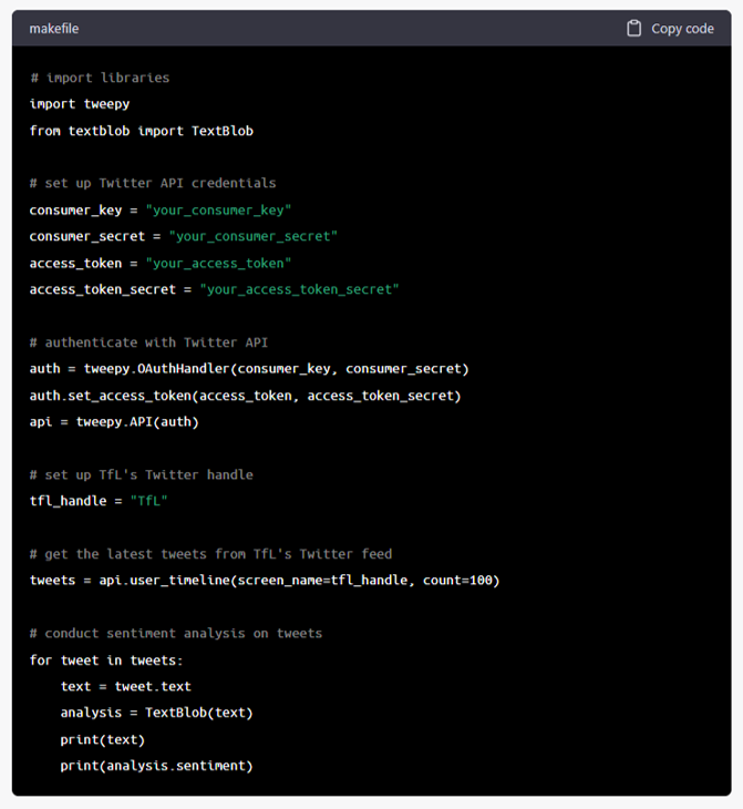 Conducting sentiment analysis on social media data, such as tweets, can be a complex task that requires a combination of natural language processing (NLP) techniques and machine learning (ML) algorithms. Here is an example of Python code that uses the tweepy library and the TextBlob library to conduct sentiment analysis on tweets from Transport for London’s (TfL) Twitter feed: