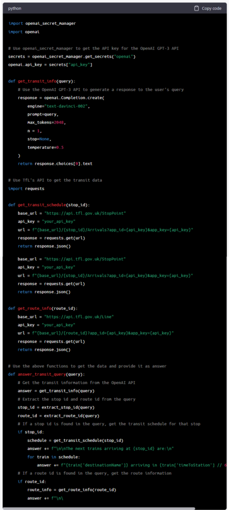 Q10. Can you share the code to integrate ChatGPT with Transport for London (TfL) website to provide real-time information about transit schedules and routes in London?