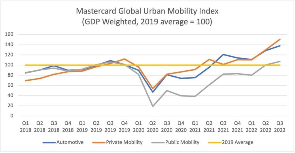 The index clearly shows that Public Mobility crossed the 100-mark relative to the same month in 2019 towards the end of 2022.